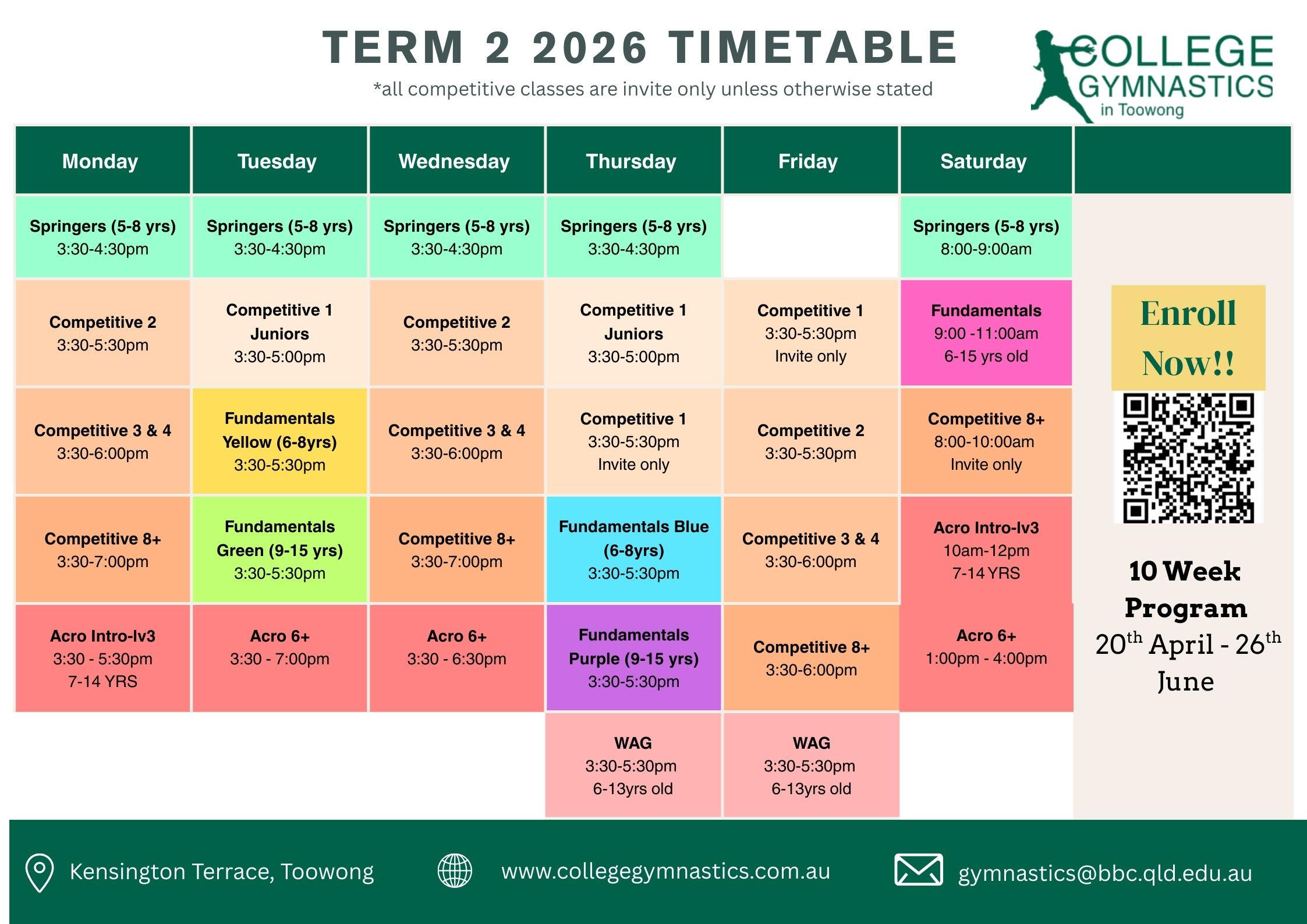 Saturday: 10:00am – 12:00pmAcro 6+: Competitive Acrobatic GymnasticsThe Acro 6+ program is designed for athletes who wish to train and compete in acrobatic gymnastics.Athletes develop advanced partner skills, strength, flexibility and routines required for competition. Training focuses on technical precision, partner coordination, and performance preparation.Entry into this program may involve coach recommendation or a trial session to ensure the class is suitable for the athlete’s age and ability.Classes: